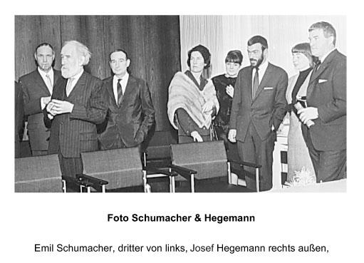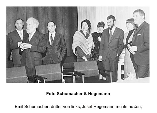 Durch seine Arbeit als Kunsterzieher in Hagen/Westfalen war Josef Hegemann auch mit Emil Schuhmacher befreundet. Wir haben das Glück, daß der Nachlaß von Jupp Hegemann noch vollständig erhalten ist und eine Fülle von Zeichnungen, Bilder und Entwürfen ca. 4000 Werke, da ist. Der Maler hat zu Lebzeiten sehr viele Nationale- wie Internationale Ausstellungen gehabt u.a. in den USA mit seinem Freund Wilfried Reckewitz, der im Corning Museum of Glass in New York ausstellte.