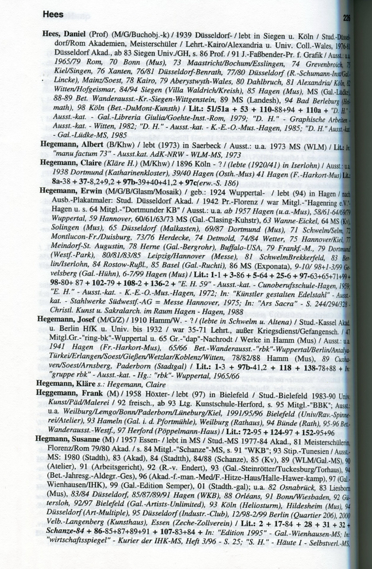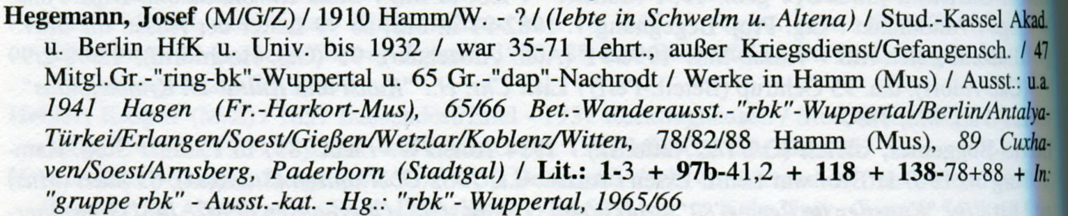 Sie sind hier: Startseite » PROJEKT Josef (Jupp) Hegemann - DER MALER » Kataloge & Bücher » Hegemann Künstlerlexikon 2001 Lexikon der Künstler Westfalen-Lippe Eintrag Josef Hegemann Ausschnitt aus dem Lexikon Seite 226 Lexikon Seite 226 Auszug Jupp Hegemann Rückseite Lexikon